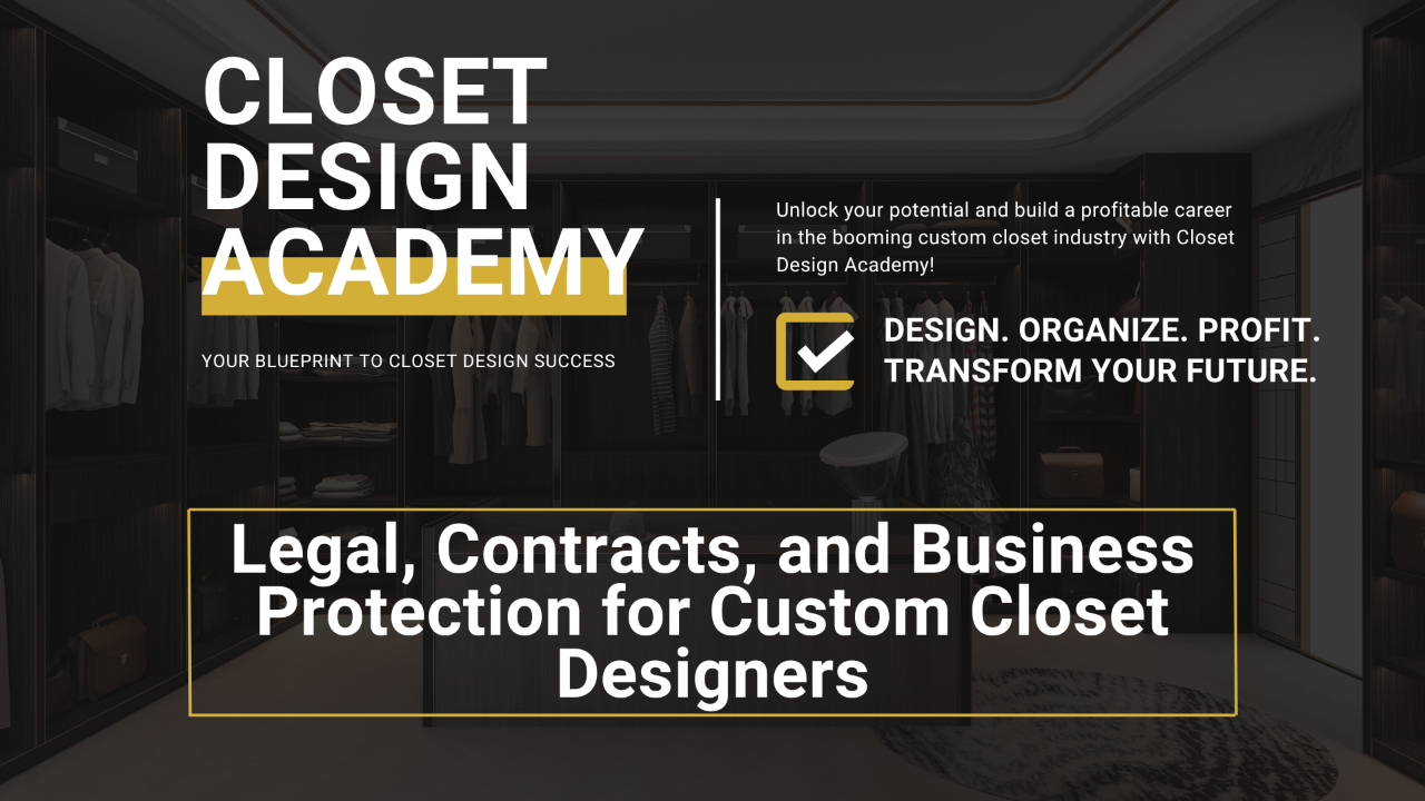 This comprehensive course equips closet designers with essential legal knowledge to protect and grow their businesses. Participants will learn how to establish the right business structure, create effective contracts, manage client disputes professionally, and implement financial safeguards. The course covers practical strategies for minimizing liability risks, handling challenging client scenarios, and planning for taxes efficiently. Designed specifically for the unique challenges of the custom closet industry, this program provides actionable tools including contract templates, refund policies, and business protection checklists. Whether just starting out or running an established design firm, participants will gain valuable insights to strengthen their business foundation and operate with greater confidence and security.